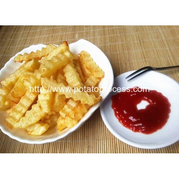 Wave Shape Potato Sticks Cutting Machine include two process, first, Machine cut the potato into potato chips and then it is cutted to wave shape stick by wave shape knife. After cutting, the surface of potato or carrot is smooth. The processing material is suitable for steam processing, boiling process, fry processing.